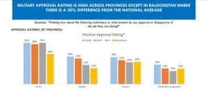 The highest percentage of acceptance was found in Sindh at 88%, while the lowest was found in Balochistan at 66%. Surprisingly, 57% of people polled said they approved very much of the army.
