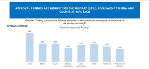The study revealed the public’s opinion on a variety of institutions, with 56% of respondents approving of the media and 56% of respondents approving of the courts, but only 42% approving of the Election Commission of Pakistan (ECP).